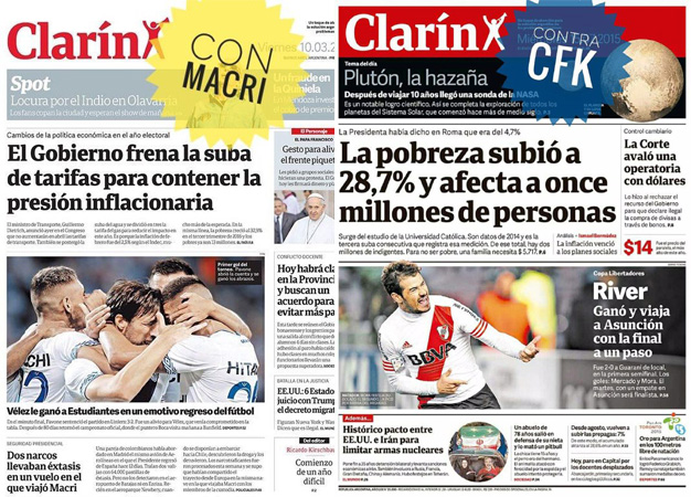 Por si alguien mantenía alguna duda de la postura de Clarín en su relación con el Gobierno nacional, la portada de hoy es reveladora. No deja dudas sobre el titulo principal de cada edición, si lo comparamos con lo que decía el mismo medio hace años atrás durante el Gobierno de Cristina Fernández.