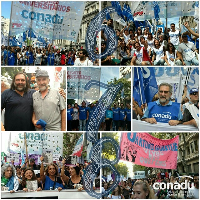 _“El gobierno nacional mantiene una posición cerrada, que desconoce el clima de descontento expresado por los trabajadores en las multitudinarias movilizaciones que venimos desarrollando, lejos de reconocer nuestros reclamos, continúa empecinado en poner un tope a las paritarias docentes para marcar una tendencia a la baja en el conjunto de los trabajadores, mientras continúan disparándose los índices inflacionarios. En este escenario, el gobierno está alimentando el conflicto y si no modifica su actitud se va a profundizar”_ expresó Carlos De Feo, Secretario General de Conadu.