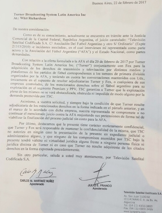 Mientras la AFA era un quilombo y nadie se ponía de acuerdo ni para comprar una birome, el negocio siguió avanzando bajo cuerda hasta llegar a la pantomima de la licitación, al ingreso de los dos oferentes bobos pero necesarios (ESPN y MediaPro) y a la frutilla del postre que fue esa carta de intención que reveló Un Caño en exclusiva hace una semana y que decía, con la firma de los apoderados de TSC (Televisión Satelital Codificada, es decir de otra empresa más del Grupo Clarín) que si Fox/Turner ganaba los derechos, la empresa iba a desistir del juicio que le había entablado a la AFA hace ya siete años por la rescisión del contrato de Fútbol de Primera (fue en 2009 y vencía en 2014). Si esto que narramos no es condicionar una licitación y romper la igualdad de posibilidades de cada una de las empresas, no sabemos muy bien de qué estamos hablando. Si no nos creen, por favor, lean la carta completa. Más clarita imposible.