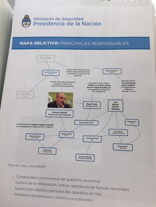 El documento que circula en las redes sociales tiene el membrete de la cartera que dirige Patricia Bullrich y el título del mismo indica que se trata de un "mapa delictivo: principales responsables", con la fotografía -en el centro- del gobernador correntino.