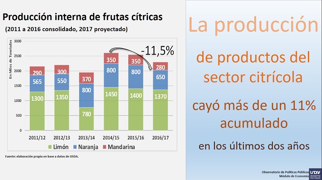 Por tanto, la situación de la economía regional de frutas cítricas mostró un retroceso en todas sus dimensiones en 2016, que se profundizó en lo que va del corriente año. En breves términos, del informe se desprende que: