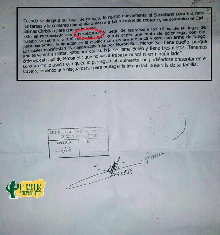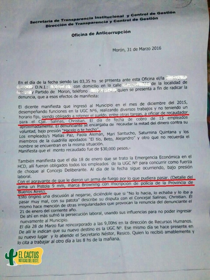 En la denuncia, radicada en la Oficina Anticorrupción el día 31 de marzo de 2016, se puede leer que el denunciante alertó sobre lo que estaba pasando a las autoridades municipales: “siendo obligado a retener el sueldo, entre otras tareas, a oficiar de recaudador para el Cjal. Salinas, Christian. El día de la fecha de cobro de 15 empleados aproximadamente”.