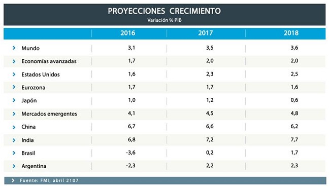 El tanto las discrepancias con las proyecciones oficiales continúan al indicar que el crecimiento llegaría a 2,2% en el año en curso a distancia del 3,5% previsto por las autoridades nacionales. El informe señala que tras contraerse el año pasado, "la actividad tiene visos de expandirse...gracias al aumento del consumo y la inversión pública, y en 2,3% en 2018 a medida que vayan recuperándose la inversión privada y las exportaciones".