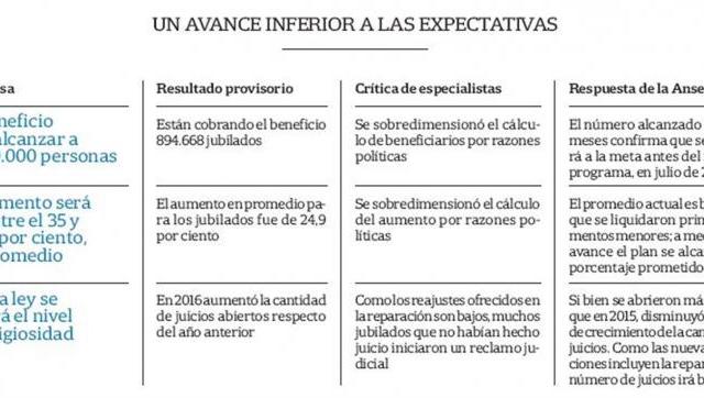 La mirada de la Anses es totalmente opuesta. Si bien Peña informó en el Congreso que la meta oficial ahora es de "cerca de dos millones" de beneficiarios, las autoridades del organismo manifestaron que el porcentaje de casos liquidados en los primeros ocho meses "es la prueba del éxito alcanzado por la propuesta". Agregaron que desde agosto pasado se otorgaron 350.000 nuevas jubilaciones y pensiones que deberían considerarse parte de la reparación histórica porque se calcularon con los índices correctos.