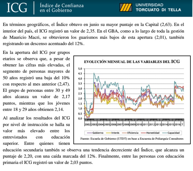 La Escuela de Gobierno de la Universidad Torcuato Di Tella dio a conocer el Índice de Confianza en el Gobierno (ICG) correspondiente al mes de Marzo de 2017.