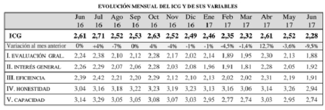 El Indice se confecciona en base a una encuesta de 1200 casos realizada por Poliarquía Consultores y se presenta en una escala que varía entre un mínimo de 0 y un máximo de 5.