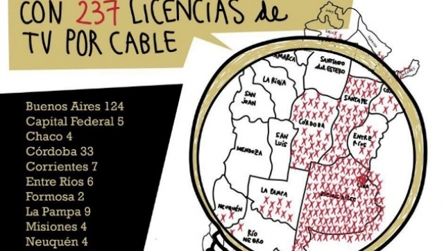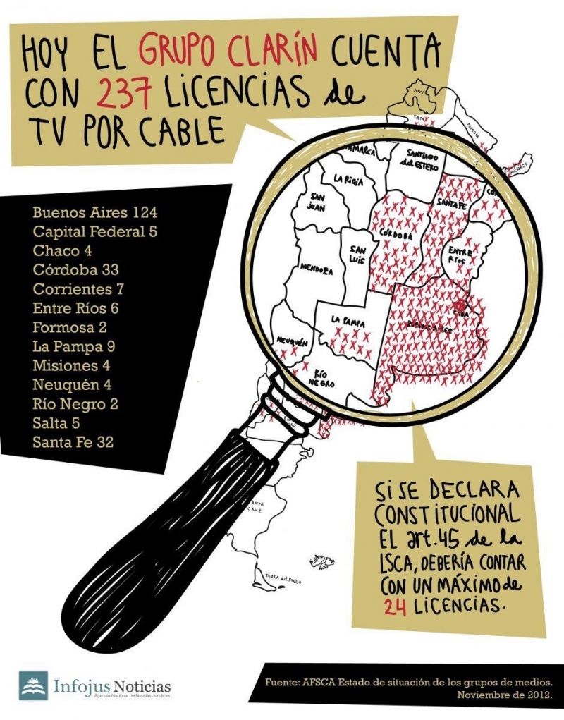 Si los artículos de la Ley de Medios que aún no están aplicados por la medida cautelar que beneficia a Clarín, son declarados constitucionales, el multimedios debería poseer sólo 24 licencias. CLICK SOBRE LA FOTO PARA AGRANDAR.