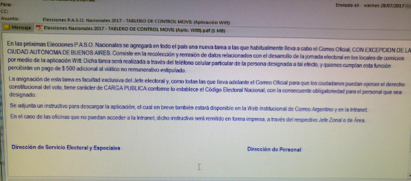 Correo Argentino contrató a Grupo MSA para proveer una aplicación que sus empleados usarán (excepto en la Ciudad de Buenos Aires) para informar en particular la afluencia de votantes a cada mesa, enviando la información a esta última empresa. Para ello pide a dichos empleados que pongan a disposición su celular, y a cambio recibirán $500. Los datos son enviados a servidores fuera del país.