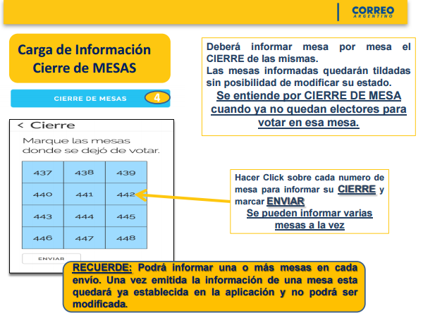 Los empleados del Correo Argentino deben enviar, a las 12 hs y nuevamente a las 16 hs, la cantidad de votantes de cada una de las mesas a las que distribuyen el material de votación. Para ello, deberían convenir previamente alguna forma de comunicarse con cada presidente de mesa, puesto que durante el comicio no permanecen en la escuela (pudiendo un mismo empleado del correo distribuir a varias escuelas, incluso en distintas localidades). ¿Para qué se hace esto? ¿Cuál es el sentido de recolectar y transmitir esta información?
