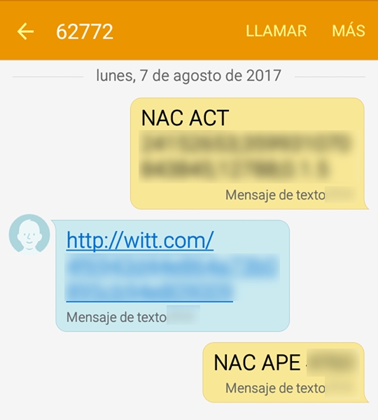 Además, al ser utilizada la aplicación envía desde el teléfono del empleado un SMS al número 62772 y recibe un URL como el siguiente: