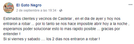 El fin de semana la pizzería El Gato Negro anunció que el pasado fin de semana tuvo que tomar la drástica decisión de cerrar el comercio por los robos.