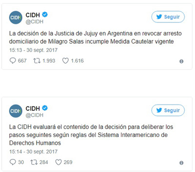 "La decisión de la Justicia de Jujuy en Argentina de revocar arresto domiciliario de Milagro Sala incumple medida cautelar vigente", indicaron.