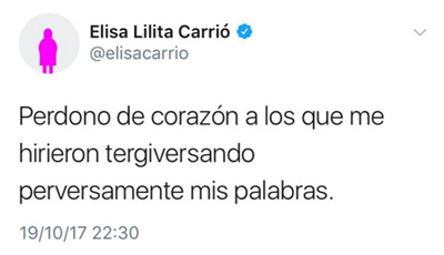 Luego de las lamentables declaraciones que dejó en las últimas horas por el caso Maldonado y que la obligaron a llamarse a silencio, la candidata oficialista volvió a provocar en las redes sociales. Pese a la cancelación de todas las intervenciones por pianta votos, Carrió no pudo con su genio y volvió a generar polémica.