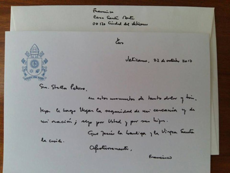 "En estos momentos de tanto dolor y tristeza le hago llegar la seguridad de mi cercanía y de mi oración; rezo por usted y por sus hijos. Que Jesús la bendiga y la Virgen Santa la cuide", indica la carta de Francisco.