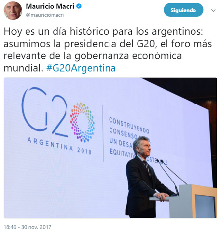 Al mismo tiempo, Macri publicaba posteos sobre la asunción de la presidencia del G20 que el año que viene tendrá como escenario a la Argentina.