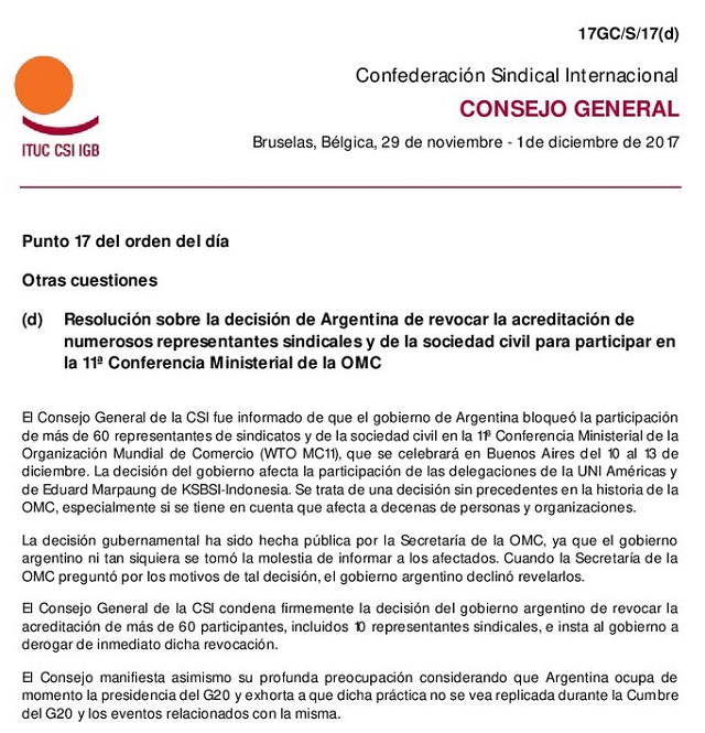 La Confederación Internacional Sindical manifestó hoy su “repudio” al “bloqueo” por parte del Gobierno de Macri a la participación de más de 60 organizaciones ecologistas en la Conferencia Ministerial de la Organización de Comercio que tendrá lugar en Buenos Aires.