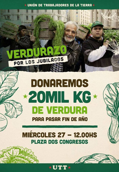 Como modo de protesta por el brutal arrebato de las jubilaciones que realizó el Gobierno los productores de la Unión de Trabajadores de la Tierra repartirán verdura. Se trata de visibilizar la crisis del sector por la apertura indiscriminada de las exportaciones.