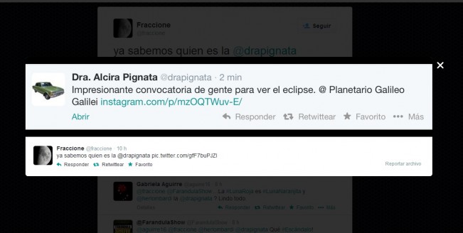 Esa madrugada, mientras se producía el eclipse de luna sobre la Ciudad de Buenos Aires, el usuario @drapignata subió a twitter una foto de las personas que se convocaron en el Planetario, desde la cuenta de Instagram de Lombardi.