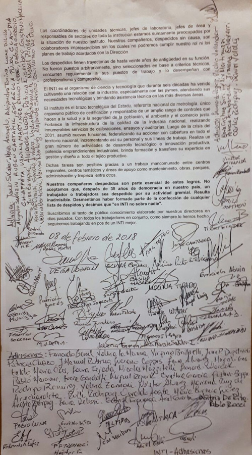 Cuando se conoció la noticia sobre la cantidad de despidos masivos en el Instituto Nacional de Tecnología Industrial (INTI) comenzó un reclamo de todos los trabajadores. Ahora también se sumaron los diferentes jefes de área que piden que sean reinsertados los más de 200 despedidos.