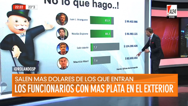 Por su parte, el polémico ministro de Energía, Juan José Aranguren, posee el 83% de su patrimonio fuera de la economía argentina (de un patrimonio de 99 millones de pesos).