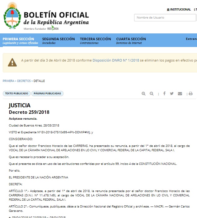 Se dio a conocer hoy el Decreto 259/2018 firmado por el Presidente Mauricio Macri y el Ministro Germán Garavano por el cual se acepta del renuncia del Juez Francisco Horacio de las Carreras a su cargo de Vocal de la Cámara Nacional de Apelaciones en lo Civil y Comercial Federal de la Capital Federal.