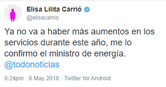 En la pantalla de TN, la diputada aseguró que no habrá más aumentos de tarifas en el año. "Yo le avisé a Macri, intuía lo que podía pasarle con el aumento de tarifas", soltó.
