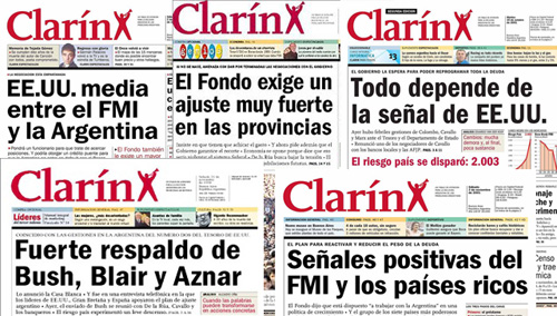 Las portadas de Clarín bastan para ver cómo se repite la historia. Mientras el Gobierno vuelve a negociar con el Fondo Monetario Internacional (FMI) mira lo que celebraba Clarín en plena crisis y lo que dice hoy.