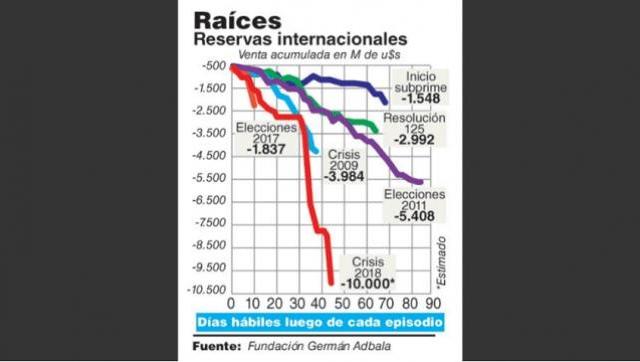 En la comparación por pérdida diaria, a la corrida actual le siguen las de las elecciones de 2017 (-u$s1.800 millones en total), la de la crisis de 2009 (-u$s4.000 M), la del 2011, la de la resolución 125 (-u$s3.000 M) y la de la crisis subprime (-u$s1.548 M). En relación al stock total, la de 2011 fue más grave que la de 2009, seguida por la de la 125 y más lejos las de la subprime y 2017.