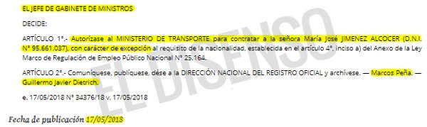 A través de la Decisión Administrativa 1021/2018 el Jefe de Gabinete Marcos Peña dio el visto bueno para que el Ministro Dietrich pueda contratar a la actriz mexicana María José Jimenez Alcocer para desempeñarse, sin especificar en que actividad, en el ámbito de la Secretaría de Obras de Transporte del Ministerio a su cargo.
