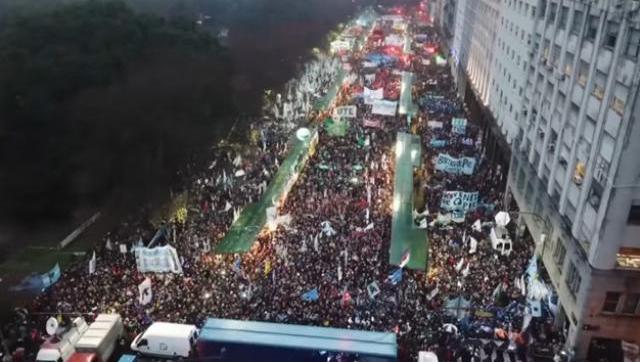Otra vez los cantos, la música y las banderas. Las calles en caída hacia el Bajo iban trasformándose en embudos humanos desde las cuatro de la tarde. El escenario se había montado en un trailer frente a un edificio desalojado por orden del Ministro de Defensa Oscar Aguad, y protegido con policías que después de varios meses volvieron a aparecer en primer plano. Parados con escudos y celulares en la parte de atrás.