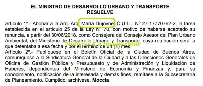En el día de hoy se publicó la RESOLUCIÓN N.° 700/MDUYTGC/18 que, en su artículo primero, indica que se debe “Abonar a la Arq. Arq. María Dujovne, C.U.I.L. Nº 27-17770762-2, la tarea establecida en el artículo 25 de la Ley Nº 70, con motivo de haberse aceptado su renuncia, a partir del 30/06/2018, como Consejera del Consejo Asesor del Plan Urbano Ambiental, del Ministerio de Desarrollo Urbano y Transporte”. Lo firma el ministro Franco Moccia.