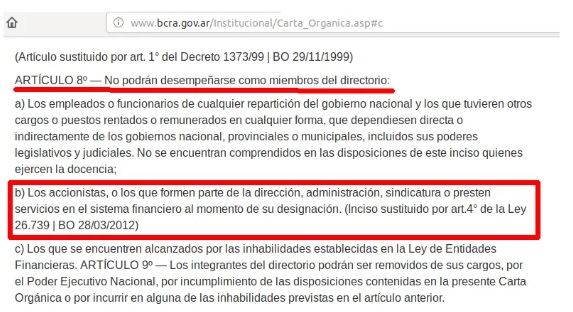 Según el artículo ocho de la Carta Orgánica del BCRA, no podrán desempeñarse como miembros del directorio: “Los accionistas, o los que formen parte de la dirección, administración, sindicatura o presten servicios en el sistema financiero al momento de su designación”.