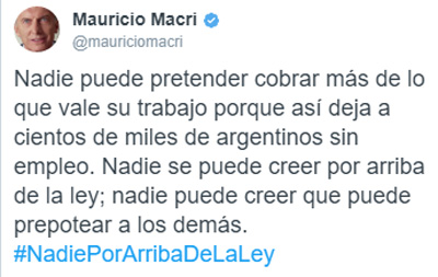 Toda su estirpe de clase es la que soltó el Presidente en las redes sociales el mismo día de la Lealtad peronista. El mensaje de Macri es el de un empresario que culpa por su fracaso a los trabajadores que tiene a su cargo, aunque en este caso es el conductor de los destinos de más de 40 millones de argentinos.