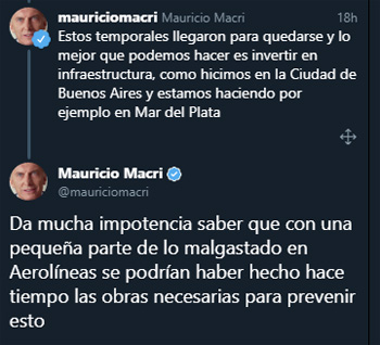 Macri aseguró sentir “impotencia” porque “con una pequeña parte de lo malgastado en Aerolíneas se podrían haber hecho hace tiempo las obras necesarias para prevenir” las inundaciones.