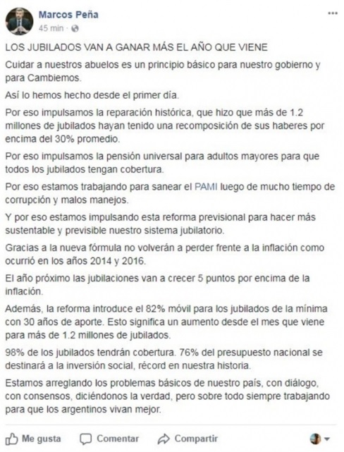 Además, un posteo de facebook del jefe de Gabinete, Marcos Peña, directamente mintiéndole a los jubilados sobre que con la nueva ley iban a ganar más y qu eno iban a perder frente a la inflación.