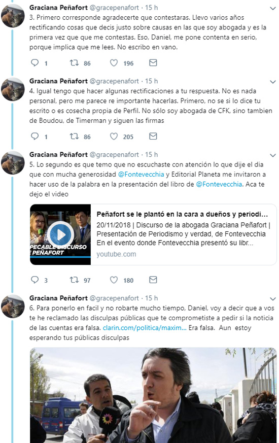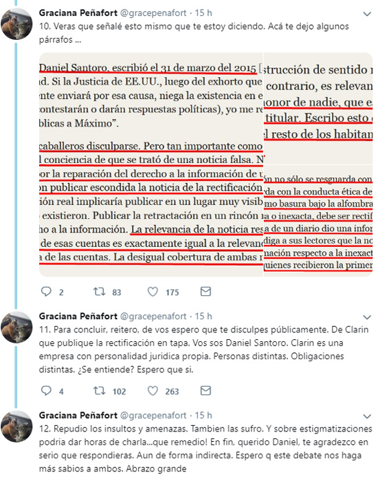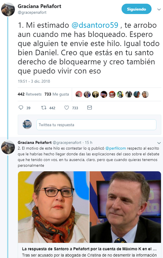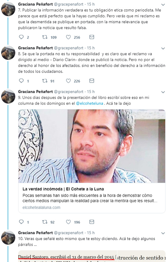 En medio de la polémica por las respuestas sobre los fake news, la abogada Graciana Peñarfot le respondió al operador de Clarín, Daniel Santoro. En el intercambio le recordó la falta del pedido de disculpas por la difamación contra Máximo Kirchner y Nilda Garré por supuestas cuentas en el exterior.