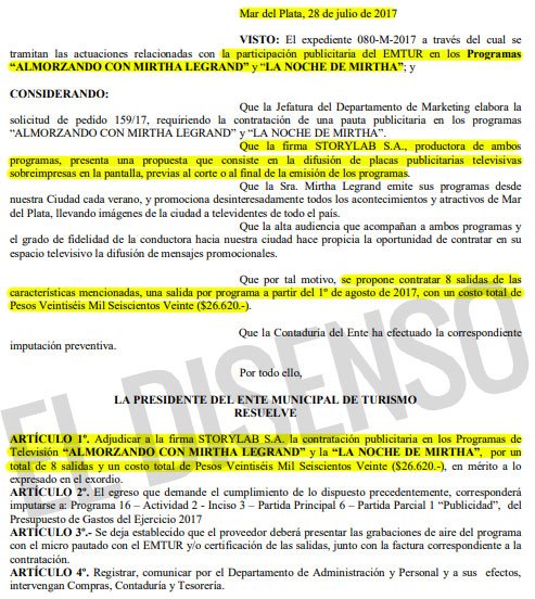 El monto exhorbitante no es el habitual para la publicidad en el programa, considerando que la Municipalidad de Mar del Plata, a través de EMTUR, pagó recientemente, por 8 salidas en el mismo ciclo televisivo, la suma de $26.620.