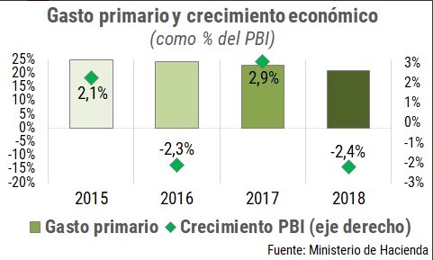 El ajuste del gasto del año pasado fue monumental. El gasto primario se redujo en dos puntos del PBI, en un año donde la economía a su vez cayó cerca de 2,5 puntos. El antecedente es 2016, donde también había caído la actividad, pero el gasto había bajado solo 0,8 del PBI.