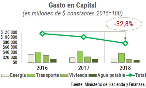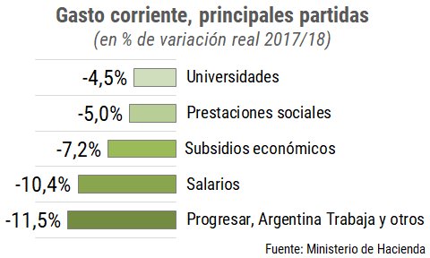 En el plano corriente, el gasto en 2018 se redujo por la caída en recursos para universidades, prestaciones sociales, subsidios a los servicios públicos y salarios a la planta de personal. Este rubro implicó un ahorro de 10,4% producto de paritarias debajo de la inflación.