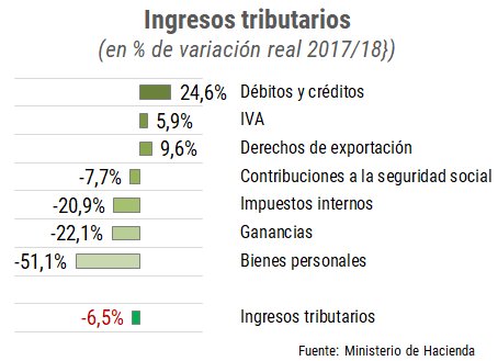 Pero los ingresos del sector público nacional también cayeron. En términos netos de la inflación, se redujeron 6,5% en comparación a 2017. Además se destaca una composición más regresiva, con mayor predominio de cheques e IVA, aunque menos de ganancias y bienes personales.