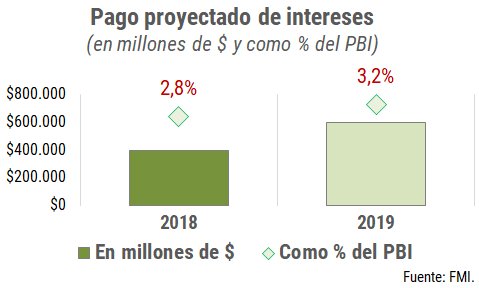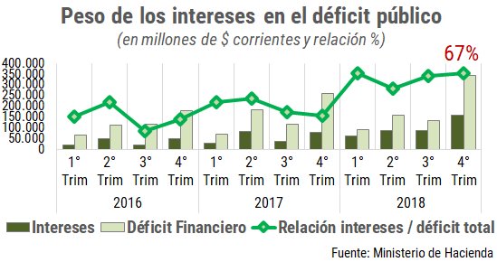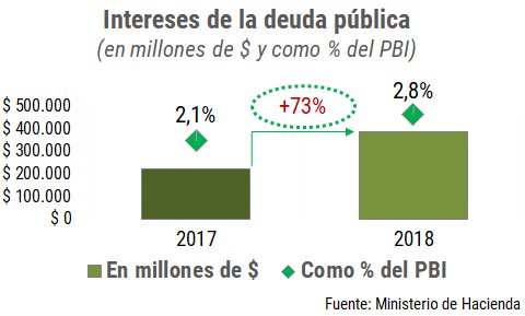Claro que uno de los puntos centrales de los números fiscales es la evolución de la cuenta de intereses de la deuda pública. En 2018 se pagaron casi $400.000 millones, esto es, un 73% más que en el 2017. Se trata de uno de los únicos rubro que creció por sobre la inflación