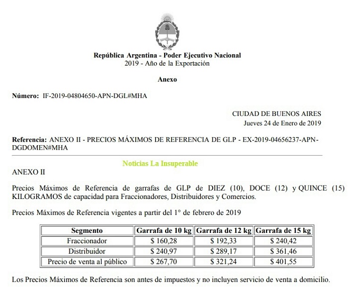 La Secreataría de Gobierno de Energía, dependiente del Ministerio de Hacienda, publicó hoy en el Boletín Oficial la Resolución 15/2019 mediante la cual, con la firma del recientemente designado Gustavo Sebastián Lopetegui, dispone un incremento a partir del viernes 1 de febrero del precio de la denominada Garrafa Social.