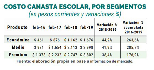 Según un estudio publicado por el Observatorio de Políticas Públicas de la Universidad Nacional de Avellaneda, el precio de la canasta escolar registró un incremento del 41,9% respecto de febrero del 2018, con un valor de $2.998 para el segmento medio.