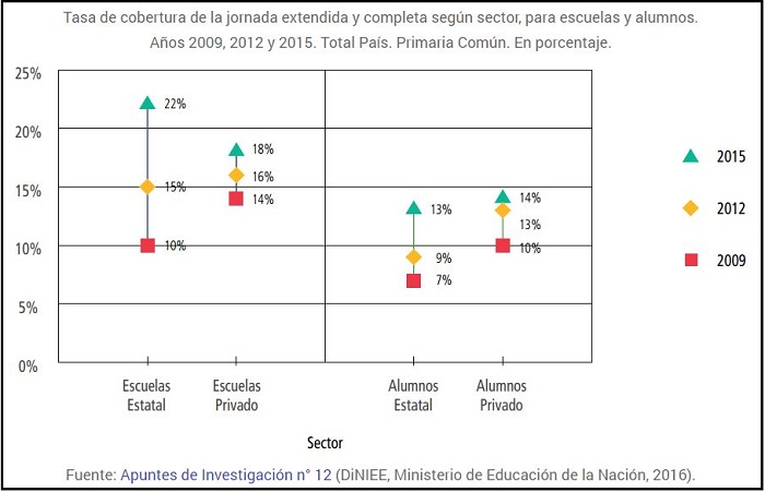 Al analizar los datos disponibles, se advierten avances importantes en cuanto a la cobertura de escuelas que ofrecen una jornada escolar extendida o completa hasta el año 2015. El crecimiento se observa con mucha nitidez en el sector estatal y es más tenue en privado: mientras que en 2009 el porcentaje de escuelas públicas primarias que ofrecían jornada extendida o completa era sólo el 10%, hacia 2015 el porcentaje se había más que duplicado, hasta llegar al 22%. En el sector privado, la evolución consignada fue menor, de 14% a 18%, para el mismo período. Cuando se analiza no ya la oferta en términos de escuelas sino la matrícula, la intensidad del incremento señalado en el sector público es algo menor (debido a la incorporación parcial de algunas secciones y no de toda la matrícula a la jornada extendida en muchas escuelas) pero también es nítida, pasando del 7% al 13%, 6 puntos en total; en privada, la evolución es menos intensa del 10 al 14%, sólo 4 puntos.