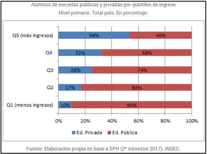 La mayor eficiencia de las escuelas privadas es un tópico sobre el que se insiste con particular interés cuando se busca justificar procesos de privatización o mercantilización de la educación. Como en muchos otros debates, existen evidencias que apoyan la hipótesis privatizadora y otras que no. En efecto, una lectura puntual de los datos puede llevar a postular que la escuela privada es más eficiente porque trabaja con mayor cantidad de alumnos por docente o porque logra mejores resultados en las evaluaciones estandarizadas. Sin embargo, los mejores resultados en estas pruebas están relacionados no con el tipo de gestión de la escuela, sino con las características sociales y socio-culturales que distinguen a la población que reciben las escuelas privadas (aquellas de mayores ingresos en mayor proporción) con respecto a la públicas: mientras que los estudiantes del quintil con más ingresos acuden en un 54% a la escuela privada, entre los que tienen menos ingresos, lo hacen sólo un 10%.