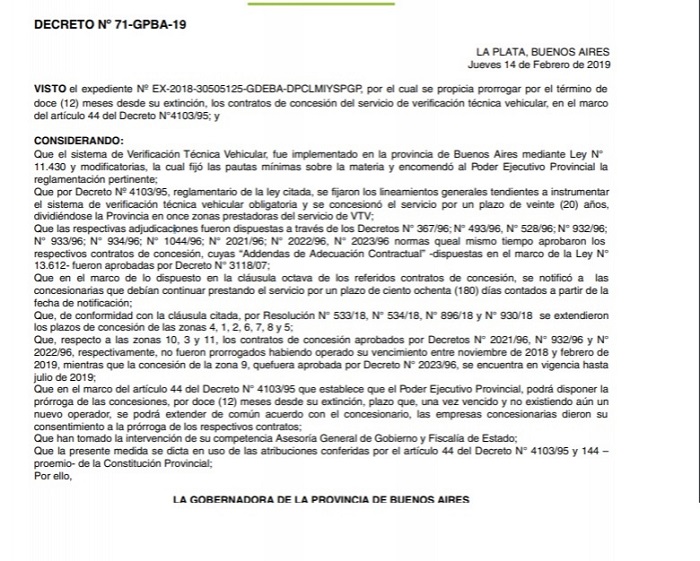 El Gobierno bonaerense volvió a prorrogar este lunes, a través de un decreto publicado en el Boletín Oficial, los contratos de concesión de la Verificación Técnica Vehicular. Se trata de un negocio que mueve más de 5 mil millones de pesos por año.