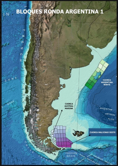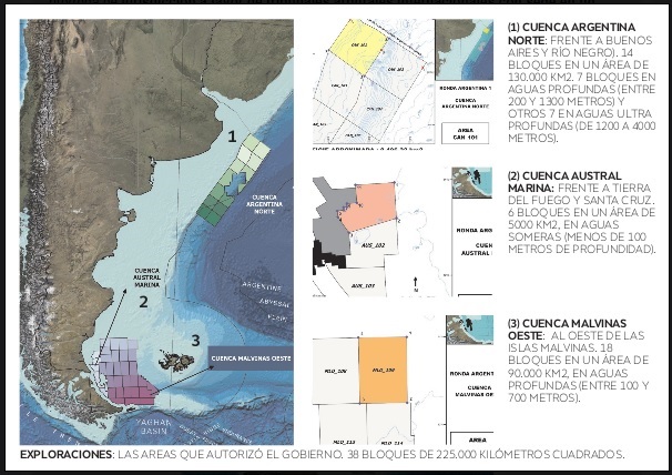 Esta primera ronda va a incluir una vasta región de la Plataforma Austral Norte (5.000 km2); la Cuenca Malvinas Oeste (90.000km2) y la Cuenca Argentina Norte (130.000 km2)”. Y el Ministerio de Energía publicó: “La Costa Afuera argentina es uno de los espacios más extensos y menos explorados con potencial de recursos hidrocarburíferos a nivel global, configurando una oportunidad única para la atracción de inversiones al país, y uno de los proyectos más importantes que tiene la Argentina para extender el horizonte de las reservas de gas y petróleo.