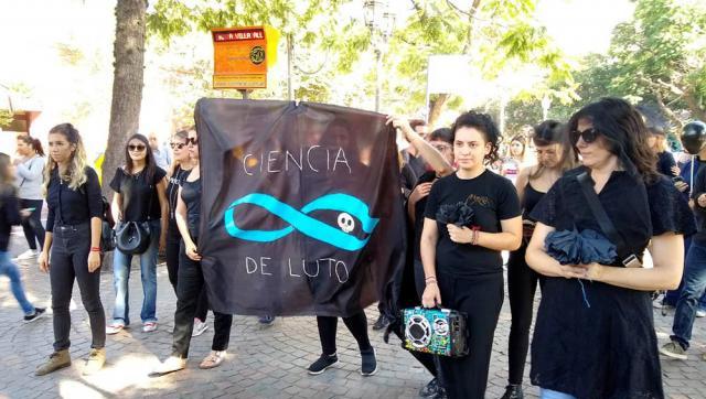 En la Ciudad, la protesta simuló un “funeral de la ciencia” que llegó con un ataúd hasta la plaza San Martín: becas que proyectan una suerte de legalidad del trabajo en negro, sueldos bajo la línea de pobreza y afectados por la devaluación, contratos precarios, embudo en el ingreso a carrera de investigador, falta de presupuestos para comprar insumos, hacer mantenimientos, subsidios para organizar congresos, conectarse con la comunidad científica internacional, no quedar aislados y sobre todo, la incertidumbre de una proyección de la ciencia a futuro como política de Estado. La lista de reclamos es larga, el impacto del vaciamiento, feroz.