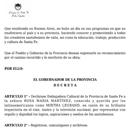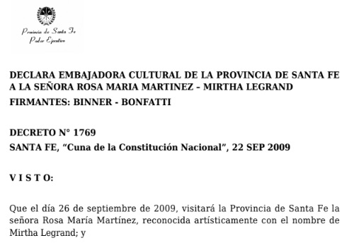 Un poco más tarde, el 22 de septiembre de 2009, el por entonces gobernador Hermes Binner y su ministro de Gobierno, Antonio Bonfatti, firmaron el polémico decreto 1769 donde distinguen con el cargo honorífico de “embajadora cultural de la provincia de Santa Fe” a la diva Mirtha Legrand.