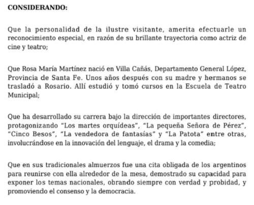 La discusión no tardó en encenderse, una vez que se conocieron los llamativos fundamentos que el socialismo santafesino utilizó para argumentar la distinción. “Que en sus tradicionales almuerzos fue una cita obligada de los argentinos para reunirse con ella alrededor de la mesa, demostrado su capacidad para exponer los temas nacionales, obrando siempre con verdad y probidad, y promoviendo el consenso y la democracia”, reza el desopilante cuadro argumental del documento.